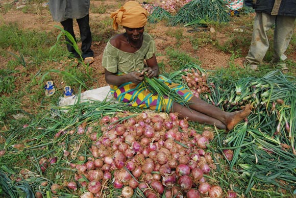 Traitement de la récolte des oignons. Les femmes coupent les feuilles d’oignons qui serviront pour les sauces alimentaires. Les oignons seront ensuite mis en sac de 100 kg pour être vendu au Burkina, en Côte d’Ivoire, ou conservés dans des hangars.