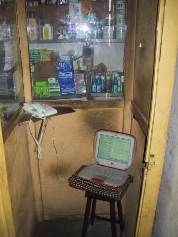 Connexion Internet! Le portable de Gilbert Cujean est branché à la ligne téléphonique de cette cabine publique, dépendant d'une petite épicerie. Les connexions sont catastrophiques (lentes, peu stables, avec des coupures aléatoires) et ne fonctionnent acceptablement qu'à partir de 23 heures. Là encore, il faut 45 minutes pour échanger une dizaine de messages et quelques images (400 à 500 KB au total), soit moins de 1200 bauds en moyenne!