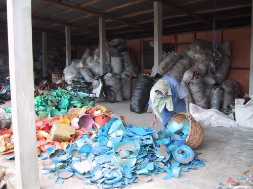 Cotonou, 6 juin 2001Les plastiques sont triés par catégories puis par couleurs (durs –photo–: vert, rouges, etc. et mous: noirs, transparents et blancs).