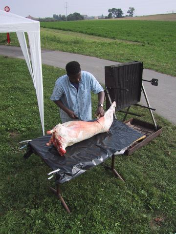 Cossonay, samedi 7 septembre 2002Repas de soutien.Karim prépare le mouton.