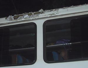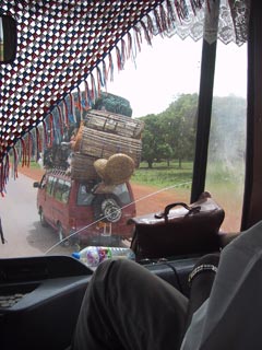 Je passe sur les détails ordinaires: bas-côtés défoncés, nids de poules géantes (il y en a moins que lors de mon voyage de mai 2004, mais ceux qui sont là sont bien là!), déviations dans la brousse pour cause de chantier, sans oublier la noria de taxis-brousse que l’on dépasse à grand renfort de coups de klaxon «spécial grande route». Ces minibus, toujours surchargés de bagages, avec 10 à 15 passagers compressés, sont des moyens de transport très populaires et presque chaque cas est «d’anthologie» (photo prise le lendemain matin).