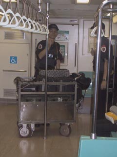 ... ou transport de fond puisque effectué tranquillement en métro, par deux gardes débonnaires. Bonne idée: vu les escaliers, escalators, ascenseurs et autres portillons, il serait très difficile pour un voleur de sortir le butin! Sans compter les caméras de surveillance.