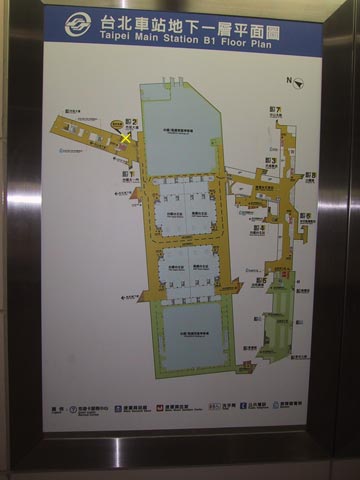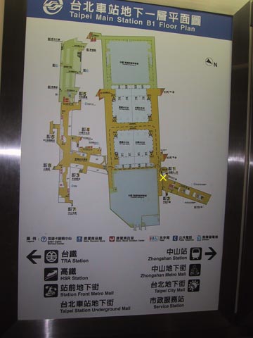 Encore une originalité du métro de Taipei? Je ne suis pas sûr que cette «vision» soit propre au MRT, mais en tous cas à Paris, le nord est tout le temps en haut des cartes. Ici, les plans de stations (et c’est pareil pour les plans du quartier environnant) sont orientés en fonction de l’endroit où ils se trouvent. Les deux plans ci-dessous du premier sous-sol de la station principale, sont affichés l’un en face de l’autre, et j’ai ajouté des croix jaunes à l’endroit où pointent les bulles «Vous êtes ici». L’effet est simple et logique: vous allez vraiment dans la direction que vous voyez sur le plan. Pas besoin du sens de l’abstraction spatiale qui devrait être inné chez les Français. Et à Lausanne? Je ne sais même pas s’il y a des plans!