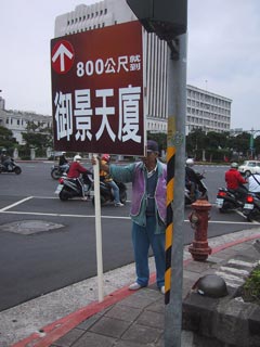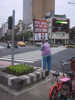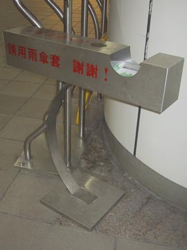 La photo n’est pas bonne, vous m’excuserez! Et pourtant, cet objet bizarre, sorte de boîte allongée en inox sur un pied, est présente à l’entrée de tous les lieux publics: métro, supermarchés, hôtels, etc. C’est un «réservoir» à étuis pour parapluies! Nous n’avons pas eu de pluie durant notre séjour (et un seul jour de soleil!), mais il pleut assez souvent et les Taiwanais sont de grands utilisateurs de parapluies. Pour ne pas mouiller le sol et le rendre dangereusement glissant, vous l’enfilez dans un étui en plastique transparent dès votre entrée à l’abri. Et il parait que ça marche! En somme une mesure de santé publique: on distribue bien des préservatifs, le geste est (presque) le même! ;-))