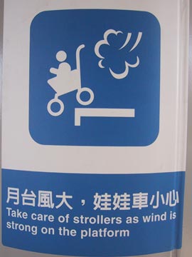 Une partie du métro de Taipei est aérien et les quais, à la hauteur des toits voisins, peuvent être balayés par le vent. Donc... [Pour ceux qui ne lisent pas l’anglais —ni le mandarin!—: «Prenez soin des landaus car le vent est fort sur le quai»].
