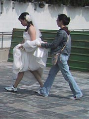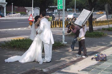 Ici le mariage est une industrie qui marche à fond et qui joue sur la tradition, ou plutôt la mode, d’un événement essentiellement basé sur le «paraître». On voit des rues entières d’entreprises de luxe, qui vendent (fort cher!) leur mariage aux amoureux. Passer par ces professionnels est paraît-il incontournable. Les prestations comportent non seulement un album de photos grand format et très «fashion», mais des livres d’or pour les manifestations, les invitations, les photos souvenir pour les invités, et surtout les 3 robes (louées) de la fiancée pour les fiançailles et LA robe de mariée (éventuellement achetée). Les 30 images de l’album sont choisies entre plusieurs centaines, faites en un ou deux jours, dans des lieux très différents (ville, campagne, mer, studio, etc.) et avec des habits, maquillages et looks les plus divers (tenues de soirée, habits traditionnels, style «top models», ou carrément «rock», «fleur bleue» ou «années folles»). En tous cas, rien de très naturel dans tout ça, mais c’est «tendance» et ça plaît, alors...