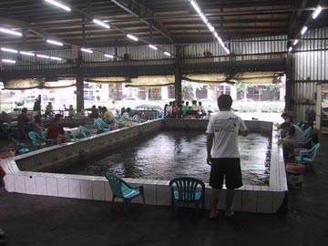 Lors d’une balade en ville, j’ai été intrigué par une sorte de grand hangar sombre, au coin d’une rue. Je m’approche pour découvrir... une sorte de pêcherie en bassins, comme on en trouve parfois chez nous, mais dans la nature. Ici, en pleine ville, à moitié sous un pont d’autoroute, on vide dans ces bassins de pleins paniers d’écrevisses ou de poissons (des carpes?), et des pêcheurs tentent leur chance.