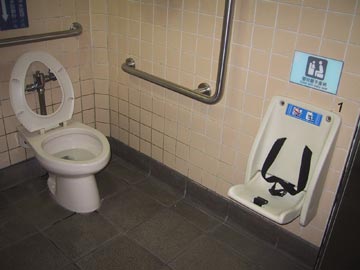D'abord, un WC public dans le métro, ou un adulte pris d’un besoin naturel mais accompagné d’un bambin, peut attacher ce dernier sur un siège spécialement conçu à cet effet, pendant qu’il poursuit son oeuvre. À noter la propreté impeccable des lieux.