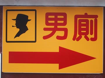 Si on vous dit de dessiner un chinois, vous penserez immédiatement au chapeau pointu et aux yeux bridés. Eh bien, le chapeau de feutre et la pipe sont les attributs symbolisant le mâle occidental (ici un panneau désignant un urinoir!).