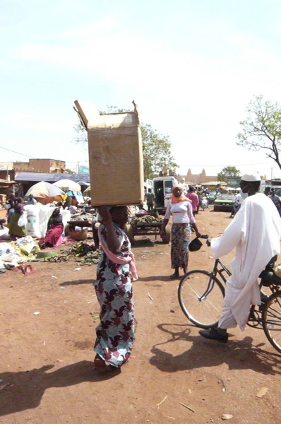 Pendant que je payais et avant que j'aie pu l'aider, Hadji, mon accompagnatrice, les avait mis l'un dans l'autre et hissés sur sa tête (il est difficile d'être galant dans ces circonstances!).