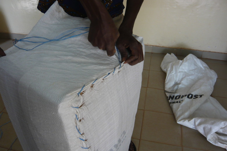 ... Le sac est ensuite cousu serré autour du carton à l'aide d'une grande aiguille. La ficelle en nylon est aussi de récupération et les brins soigneusement noués bout à bout. C'est vraiment un travail de spécialiste et notre «emballeur» s'y entend particulièrement bien.