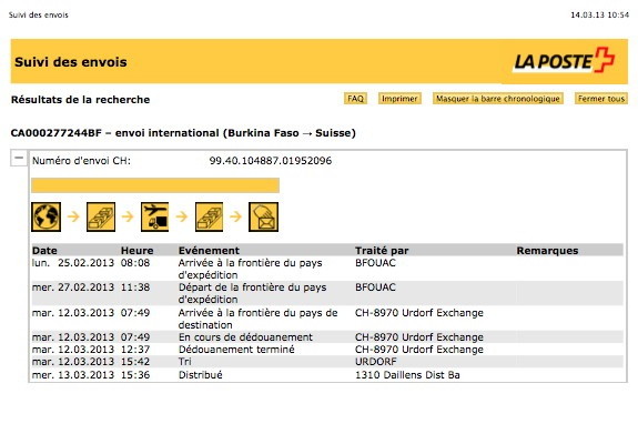 Voici les pérégrinations du premier des colis jusqu'à sa distribution à mon adresse. À noter la rapidité du dédouanement, sans documents ad-hoc ni facture!...